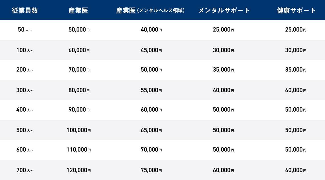初期費用0円。産業医、精神科産業医、メンタルサポートの月額は下記をご覧ください。